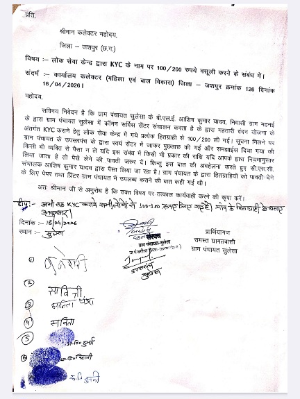 ग्रामीणों ने इस वसूली का विरोध करते हुए सरपंच और पंचों के साथ मिलकर जिला कलेक्टर से शिकायत की है। उनका आरोप है कि सुलेसा कॉमन सर्विस सेंटर (CSC) के संचालक आशीष यादव द्वारा ई-केवाईसी के नाम पर पैसे लिए जा रहे हैं, जबकि शासन की योजनाओं में इस तरह का कोई शुल्क निर्धारित नहीं है।