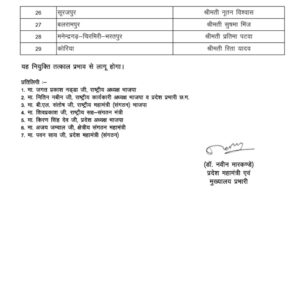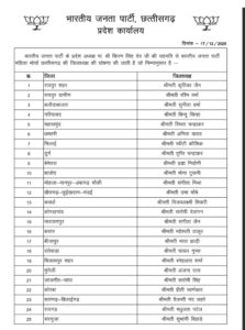 छत्तीसगढ़ में भाजपा की संगठनात्मक नियुक्तियां जारी कर दी है। इस कड़ी में आज बीजेपी प्रदेश अध्यक्ष किरण देव सिंह की सहमति से प्रदेश के 29 जिलों के महिला जिलाध्यक्षों की नियुक्तियां जारी की गई है। जारी आदेश में देखे सभी जिलों के अध्यक्षों की सूची….
