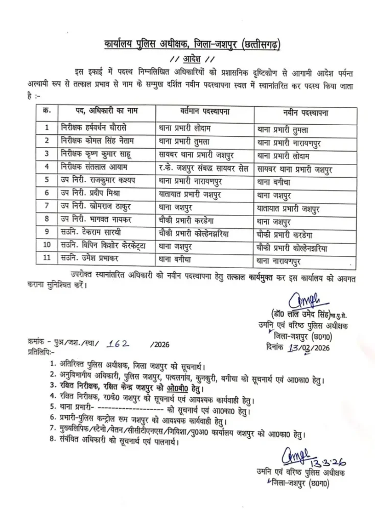 ब्रेकिंग जशपुर – एक साथ जिले के कई थानों के थानेदार बदले गए,4 एसआई,3 ASI भी बदले गए…