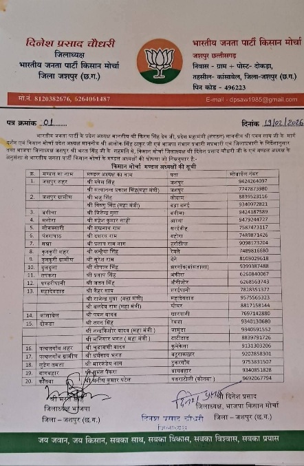 भारतीय जनता पार्टी जिला जशपुर ने संगठन को मजबूत बनाने के उद्देश्य से किसान मोर्चा की नई जिला कार्यकारिणी और मंडल अध्यक्षों की सूची जारी की है। ये नियुक्तियां प्रदेशाध्यक्ष किरण सिंहदेव संगठन महामंत्री पवन साय,जिलाध्यक्ष भरत सिंह की सहमति और जिला अध्यक्ष दिनेश कुमार चौधरी की अनुशंसा पर की गई हैं।